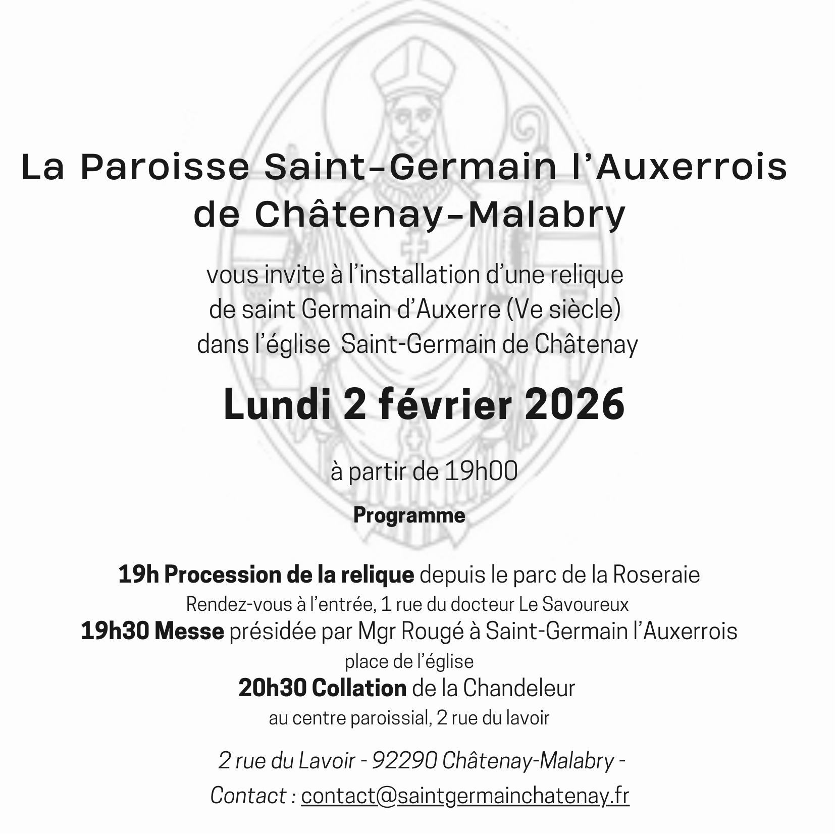 - Lundi 2 février Fête de la Chandeleur. 19h Procession de la relique de st Germain. 19h30 messe à St-Germain, installation de la relique. 20h30 collation.